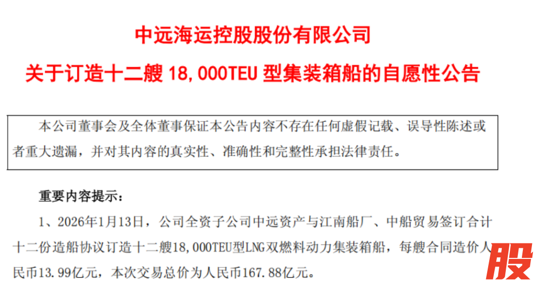 航运巨头中远海控掷下近188亿元“重注”,启动新一轮船队升级与扩张。1月13日晚,中远海控公告订造共18艘集装箱船,两项投资合计187.68亿元。