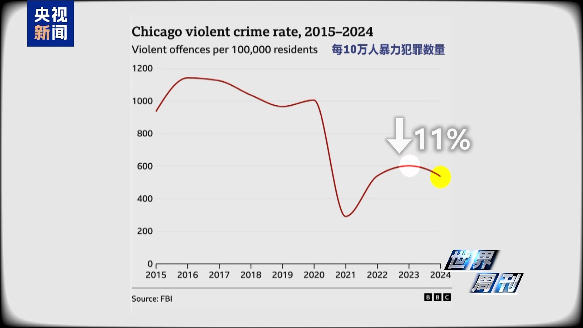 而英国广播公司援引美国联邦调查局(FBI)的数据显示,2024年,芝加哥每10万人中有540起暴力犯罪,暴力犯罪率比2023年下降了约11%。